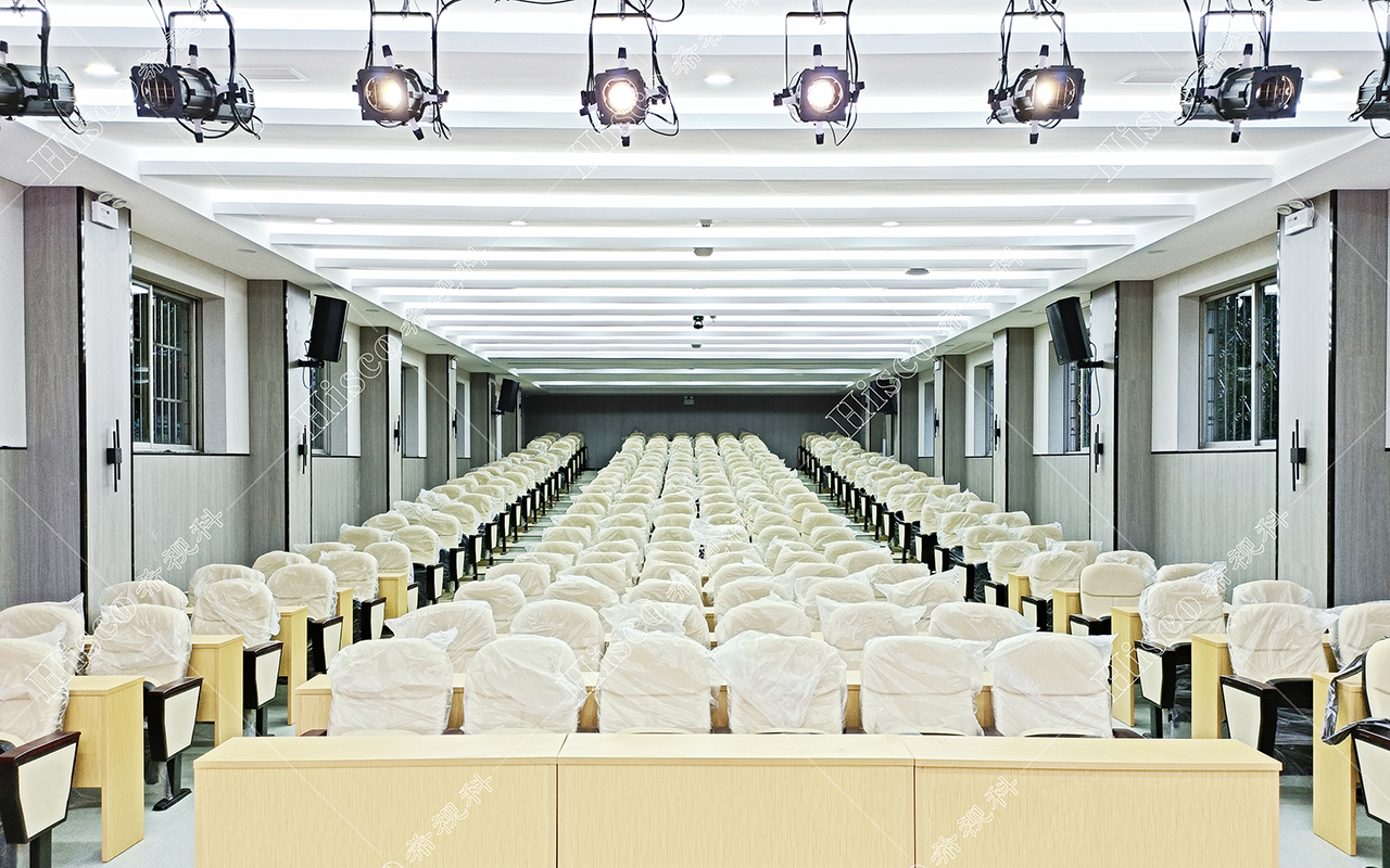 本校报告厅是一个中大型报告厅,主要为举办学校学术会议、演讲、公共大课培训及各种文艺演出,根据其建筑结构特点和使用功能及国家相关标准,根据面积和观看距离选择合适的LED大屏,展现整个舞台的宏伟大气;扩声采用集中与扩散相结合的扩声方式,开会和报告时采用单声道集中扩声还原模式,所有音源都从主席台发出,声像的平衡、方位无倾斜,保证了下面学生听到的直达声响度和均匀度达到要求,让学生听的适宜和舒服。演出时采用左右立体声空间成像模式,直达声与辅助音箱的效果声相结合表演,传达表演意境,使得演员和观众之间产生一种无声的交流。