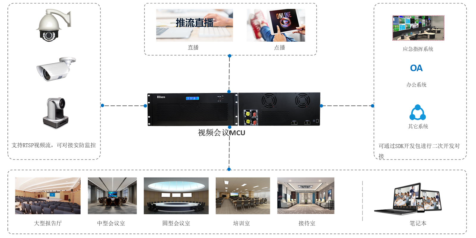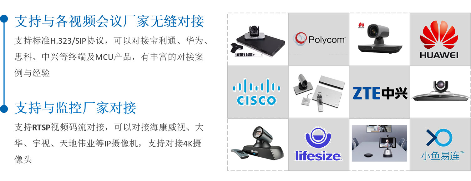 2)全媒体融合:支持 H.323/SIP/RTSP/SCM协议,兼容主流视频会议品牌终端