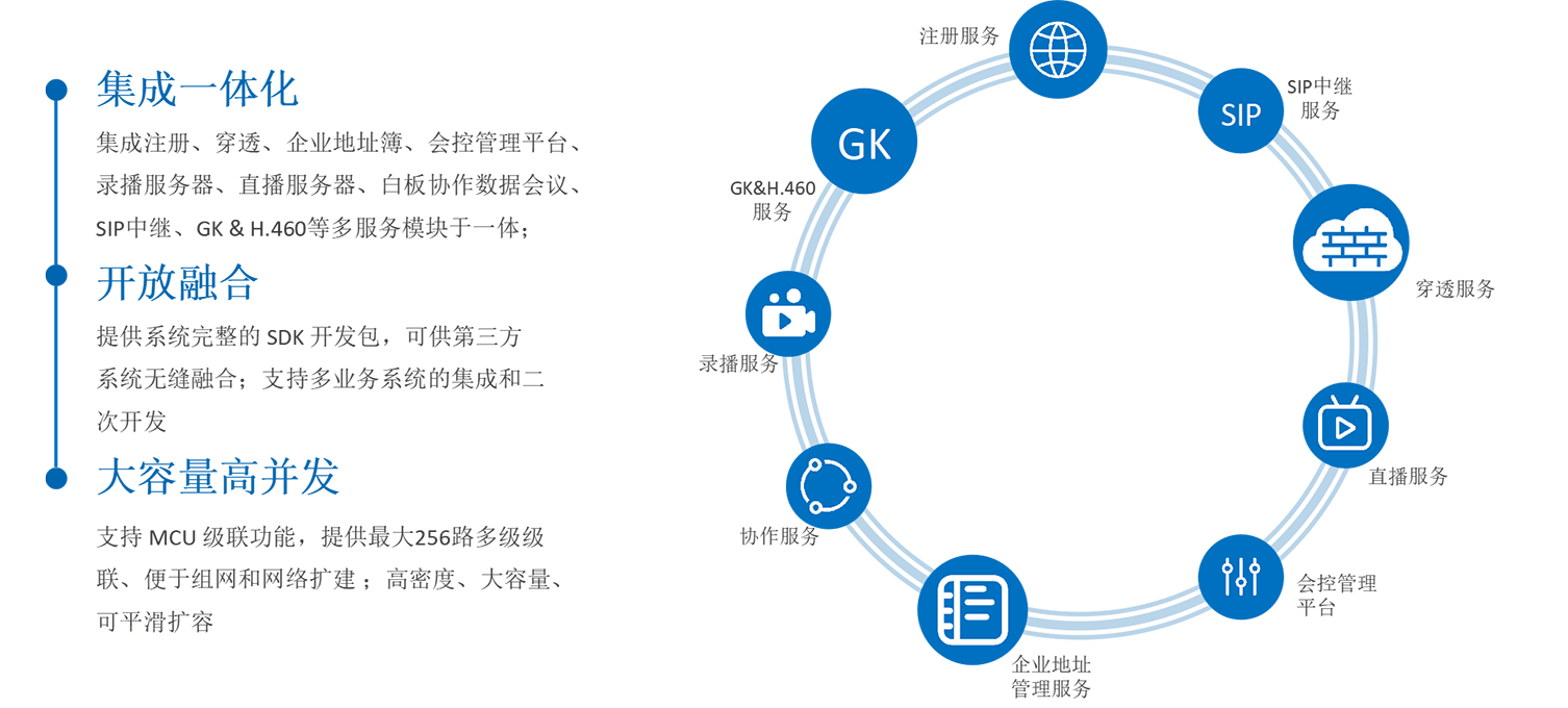 极致高清视频:新一代多点控制单元、全媒体融合MCU,支持H265 4KP30双流会议和多流转发能力,采用新一代高清编解码器H.265 SCC实现主辅流最高4K分辨率的视频会议,天然融合视频、音频、辅流、数据,提供无缝的沟通协作能力。