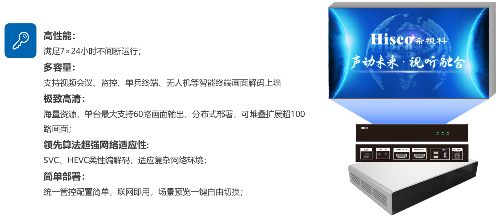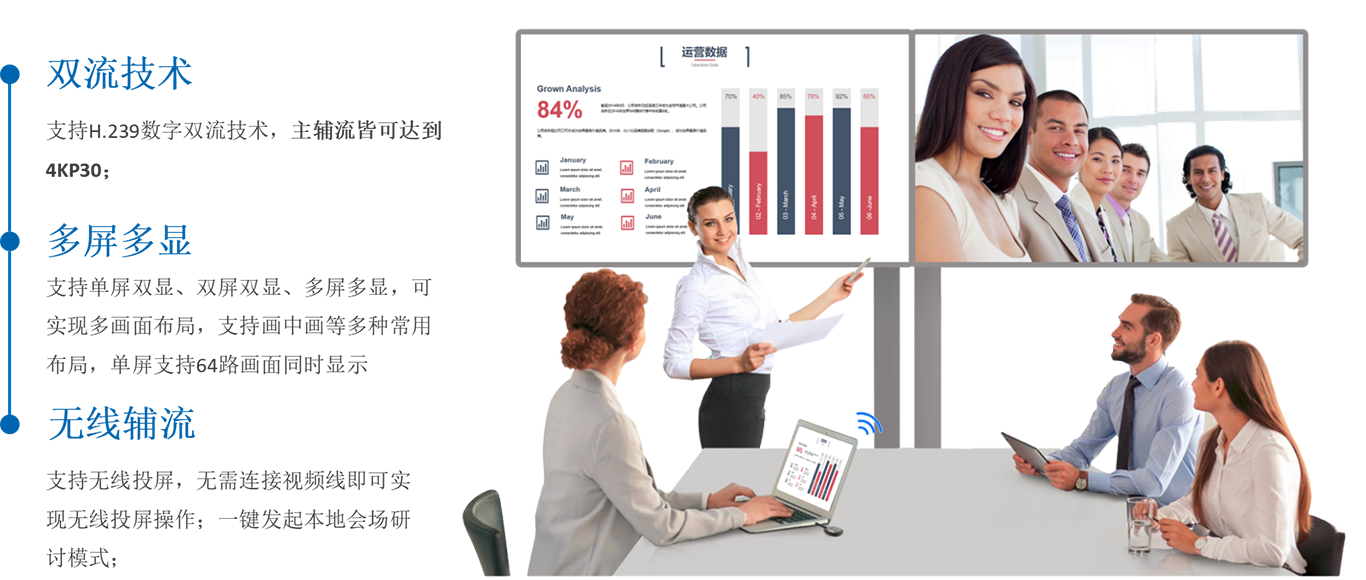 极致高清,支持H265、H264 SVC、H264 HP等编码协议,主辅流皆可达到4KP30的超高清、全融合、国产化、高可靠的视频会议系统。